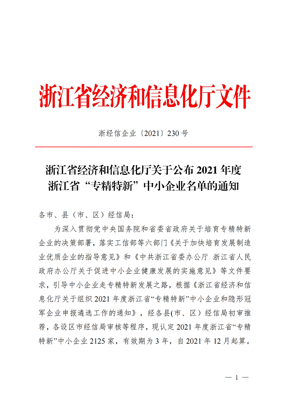 KY.COM-开元(中国)荣获浙江省“专精特新”中小企业