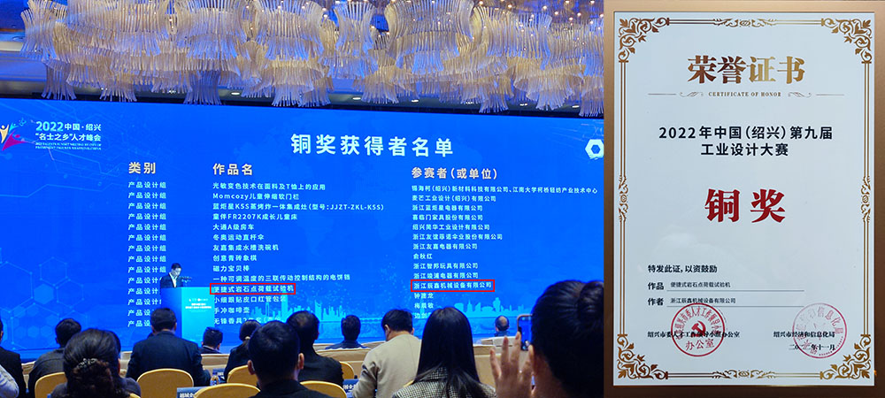 我司便携式岩石点荷载试验机在2022年中国(绍兴)第九届工业设计大赛的240件作品中脱颖而出获得铜奖