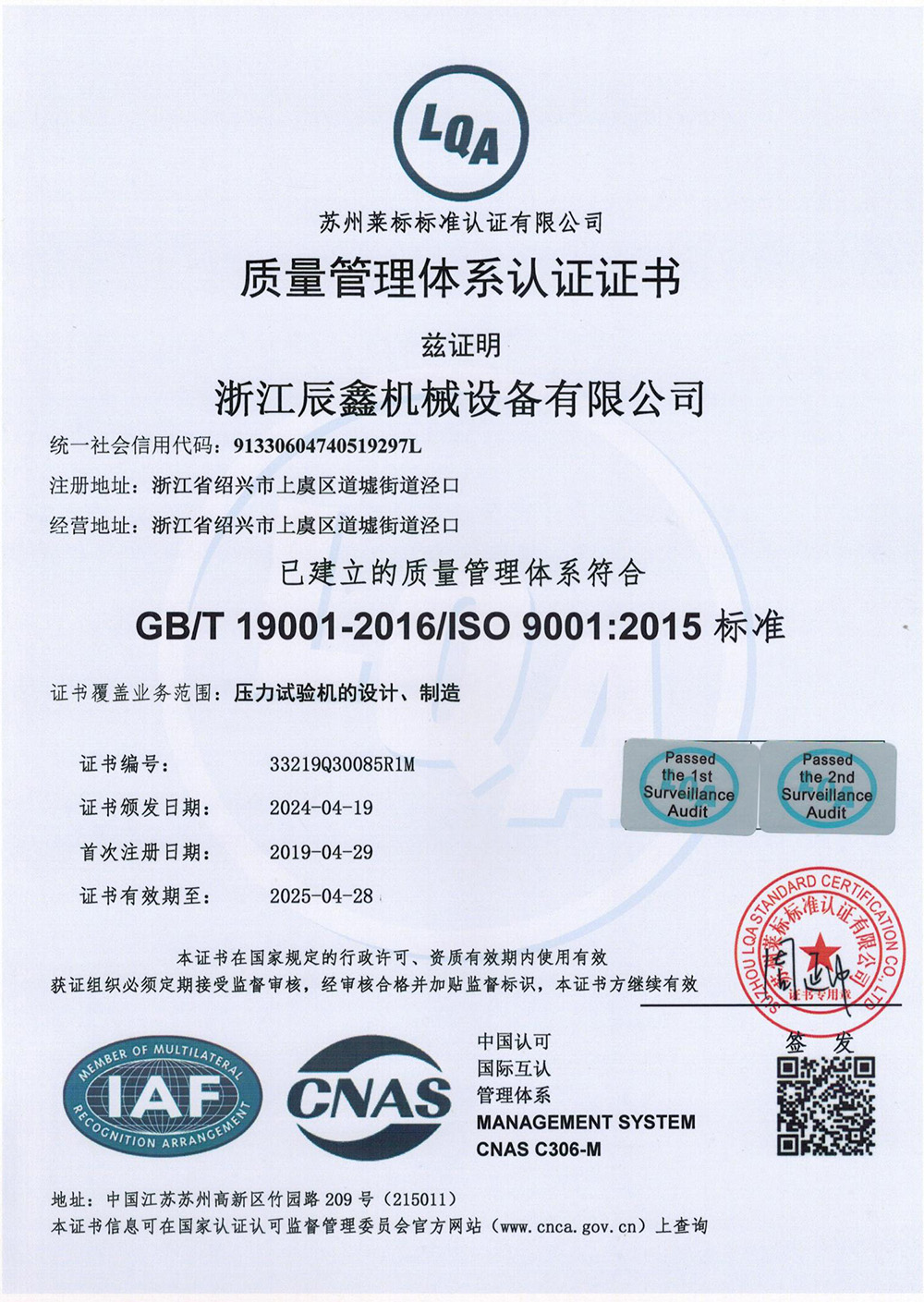 质量管理体系认证证书