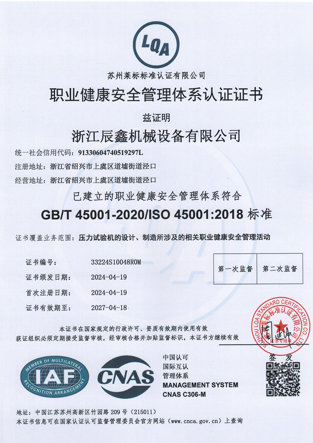 职业健康安全管理体系证书